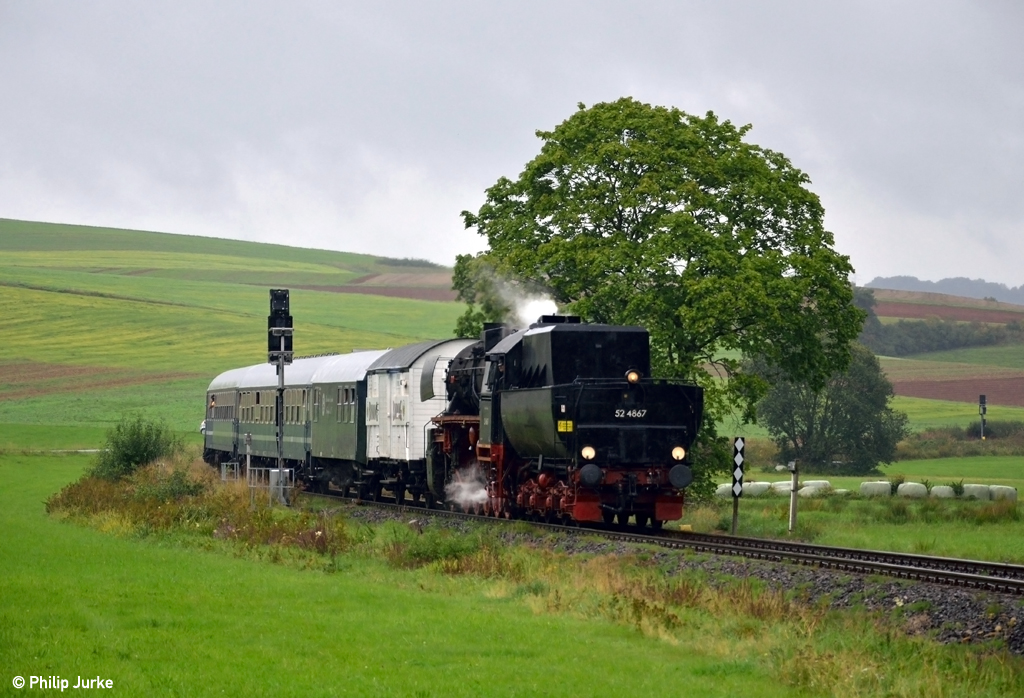 52 4867 mit dem DPE 25741 (Frankenberg(Eder) - Frankfurt(Main)Hbf) am 13.09.2015 bei Münchhausen.