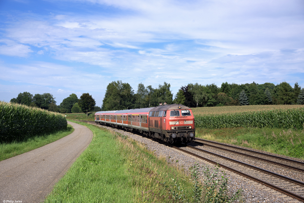 218 432-3 mit dem IRE 4217 (Stuttgart Hbf - Lindau Hbf) am 29.07.2017 bei Aulendorf. Hinweis: Eine Kilometertafel wurde elektronisch entfernt!