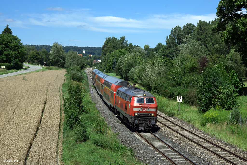 218 427-3 mit dem IRE 4215 (Stuttgart Hbf - Lindau Hbf) am 29.07.2017 bei Mochenwangen.