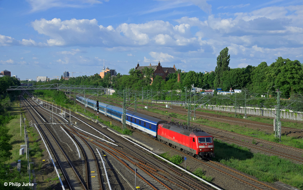 120 125-0 mit dem EN 477 (Berlin Hbf - Budapest-Keleti) sowie den Kurswagen des EN 60477 (Berlin Hbf - Wien Westbf.) am 30.05.2014 in Berlin-Südkreuz.