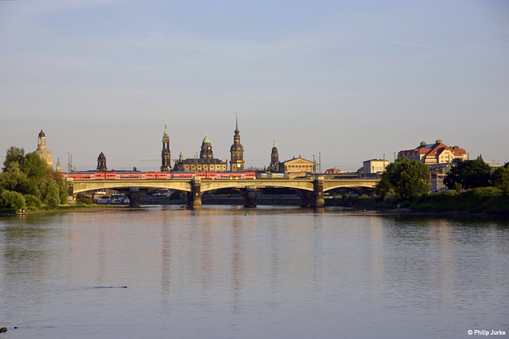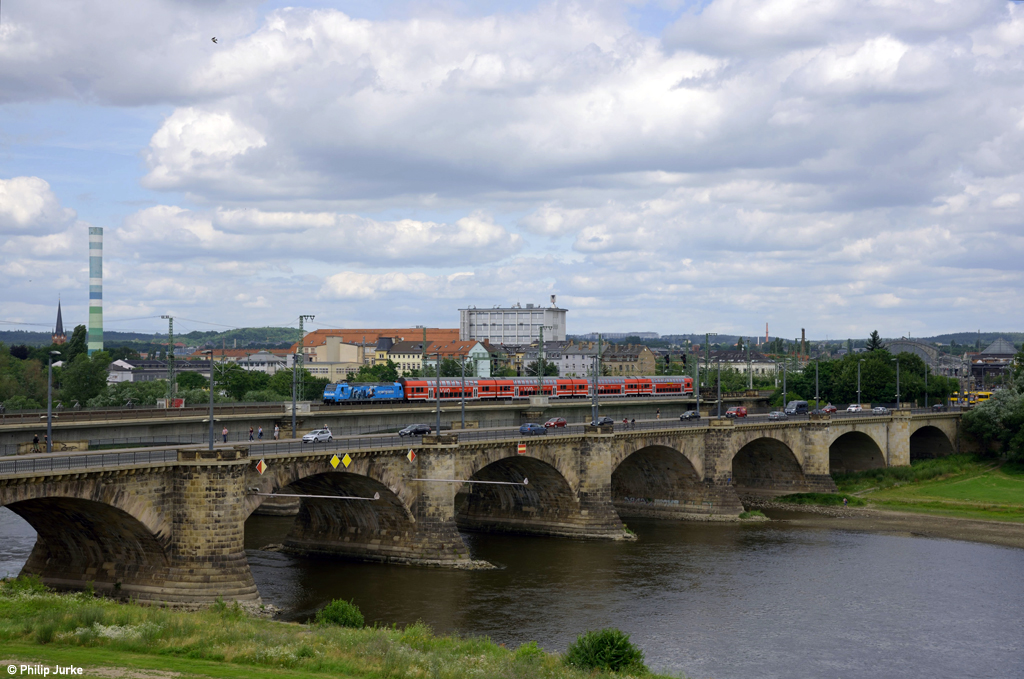 146 017-9 mit dem RE 16531 (Leipzig Hbf - Dresden Hbf) am 09.07.2016 auf der Dresdener Marienbrücke.