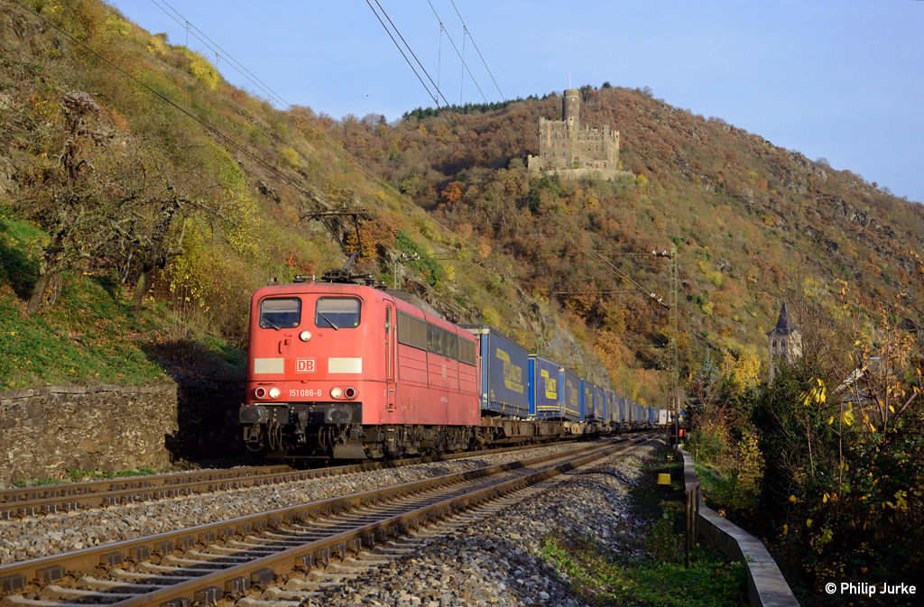 151 086-6 mit dem KT 40542 (Verone Q.E. - Geleen-Lutterade) am 08.11.2015 zwischen St. Goarshausen und Kestert.