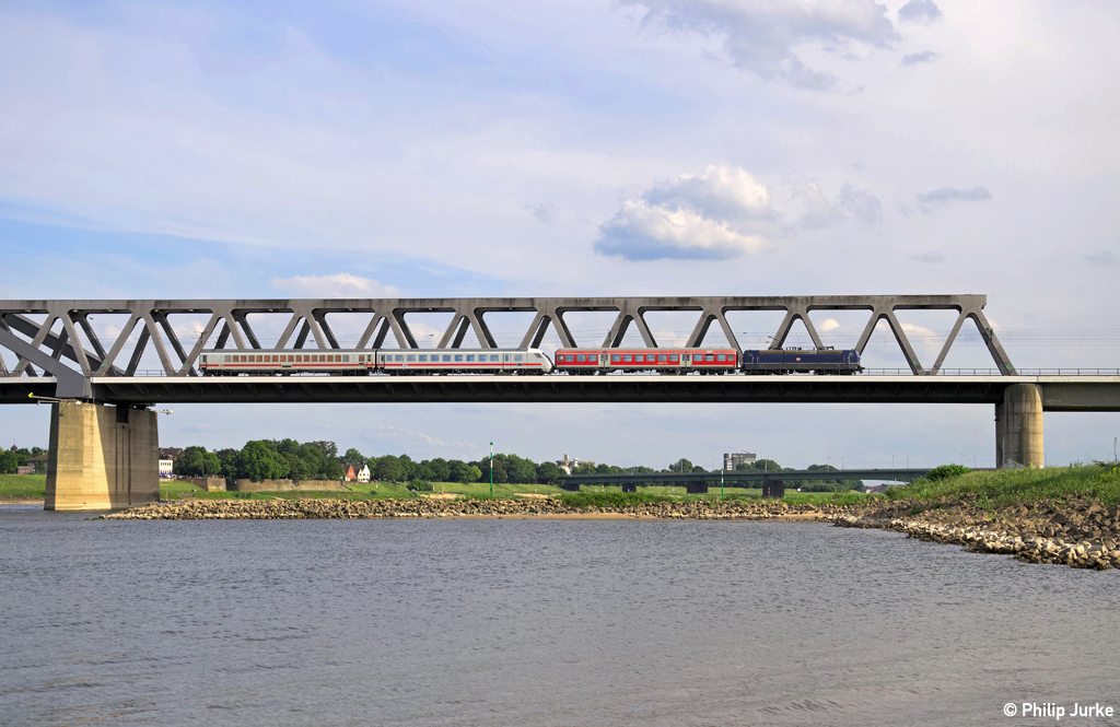 181 201-5 mit dem PbZ 2477 (Dortmund Bbf - Frankfurt(Main)Hbf) am 25.05.2014 auf der Hammer Rheinbrücke zwischen Düsseldorf und Neuss.