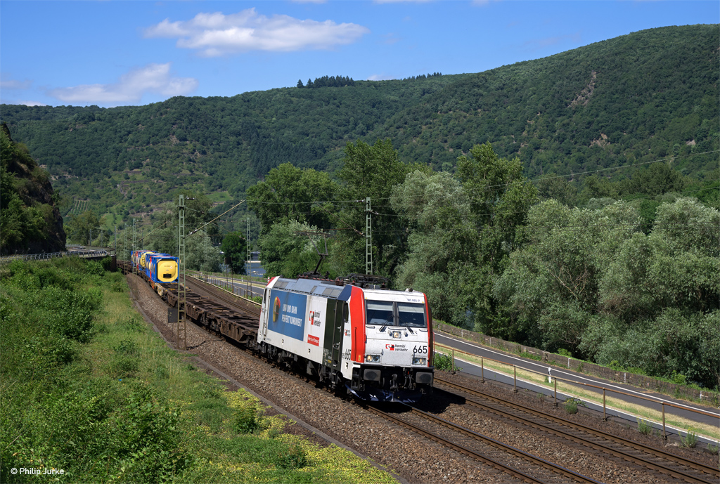 185 374-6 mit einem Mischer am 13.07.2017 zwischen Lorch und Assmannshausen.
