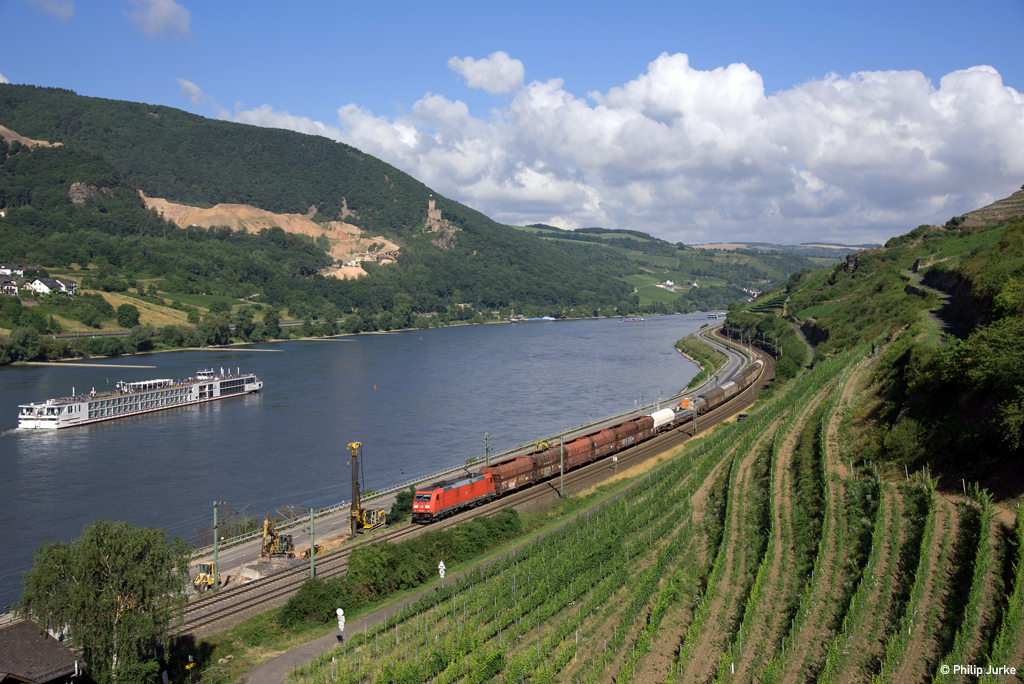 185 374-6 mit einem Mischer am 13.07.2017 zwischen Lorch und Assmannshausen.