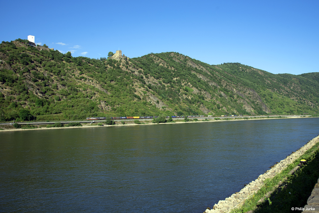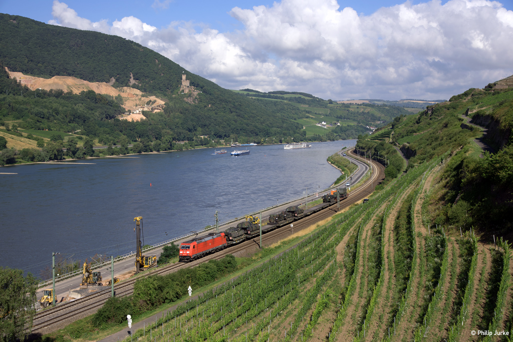 185 393-6 mit einem Militärzug am 13.07.2017 zwischen Lorch und Assmannshausen.