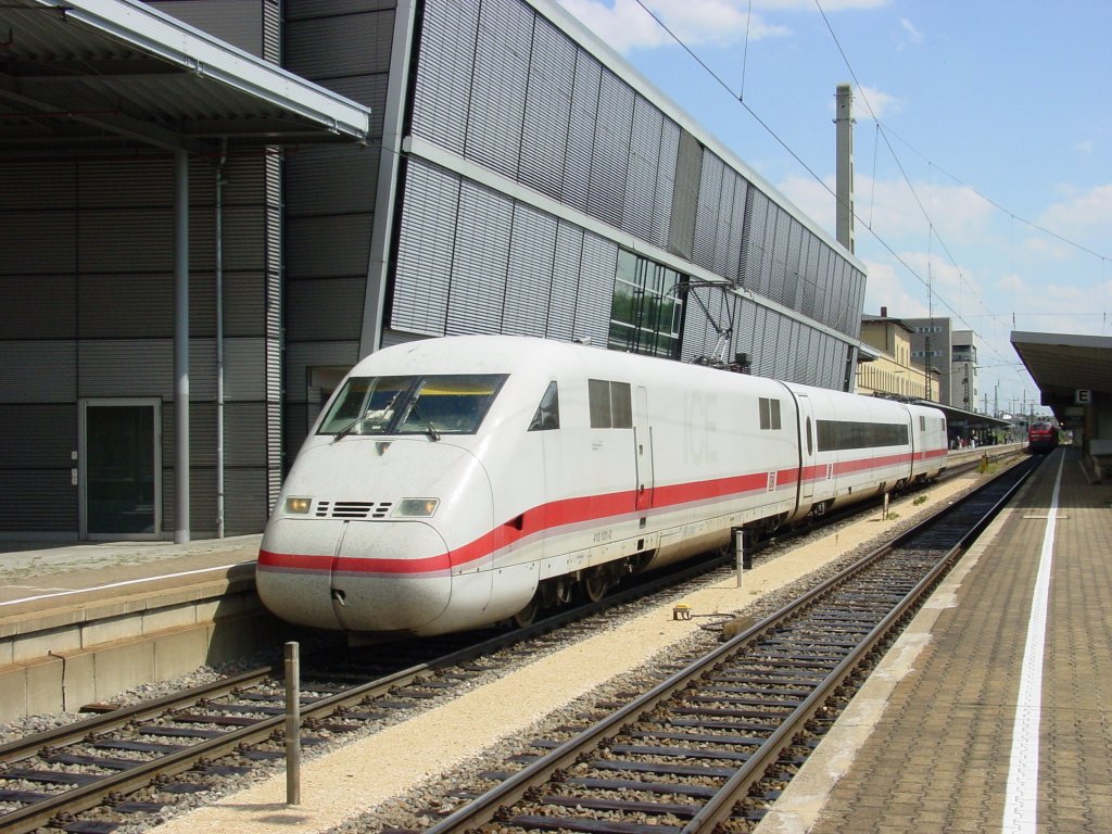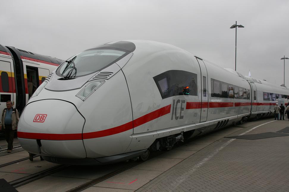 Der ICE "Montabaur", mit Werbung für die Damen-WM 2011 (403 512-7), aufgenommen am 04.05.11, bei der Überquerung der A8 bei Jettingen-Scheppach.