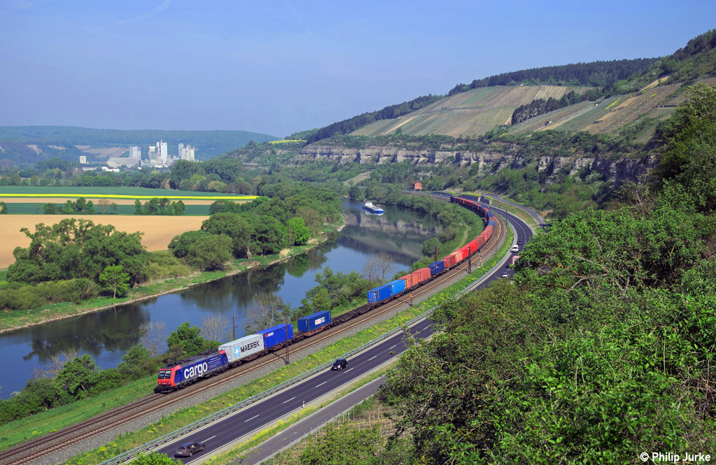 482 048-6 mit einem Güterzug am 16.07.2015 an der Staustufe Harrbach.