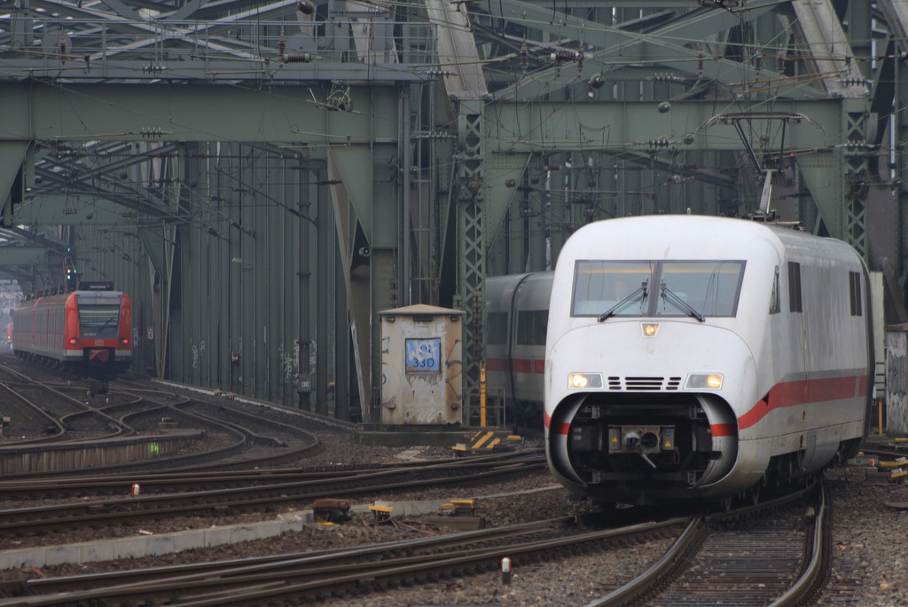 Ein ICE 2 und im Hintergrund ein 423 überquerten am 28.02.2011 die Hohenzollern Brücke