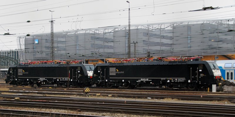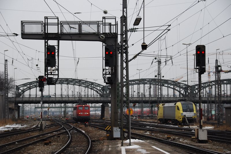 ES 64 U2-070 steht abgestellt im Vorfeld des Hbf München, während sich im Hintergrund der EC 113 auf den Weg nach Österreich macht. Aufgenommen am 23.01.10.