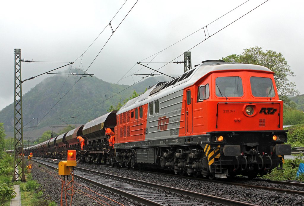 230 077-0 der RTS wartet darauf mit ihrem Schotterzug losschottern zu können , zwischen Rhöndorf und Bad Honnef am 06.05.2012