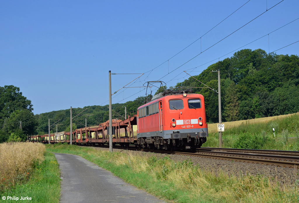 140 637-0 mit dem EK 53502 (Emden Volkswagenwerk - Seelze Rbf) am 17.07.2015 zwischen Ibbenbüren-Laggenbeck und Osnabrück-Altstadt.