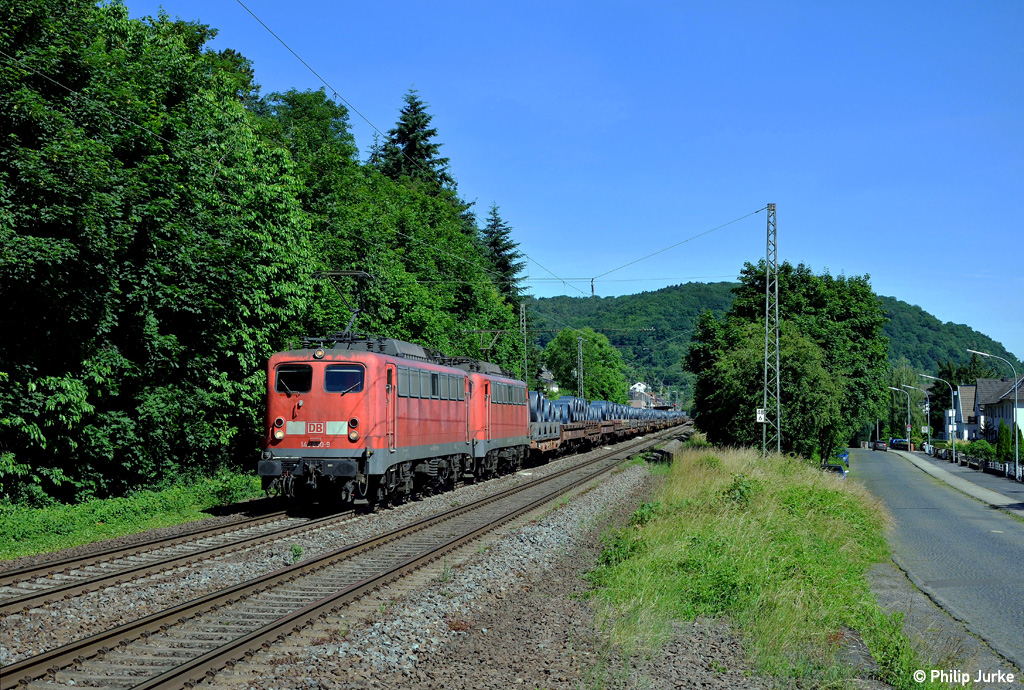 140 128-0 und 140 423-5 mit dem DBM 91511 (Frankfurt(Main)Hbf - Koblenz-Lützel) am 14.06.2015 zwischen Boppard Hbf und Spay.