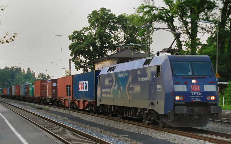 ES 64 U2-096, IBS, aufgenommen vor einem Containerzug, bei der Einfahrt in den Bahnhof Treuchtlingen, am 19.03.11.