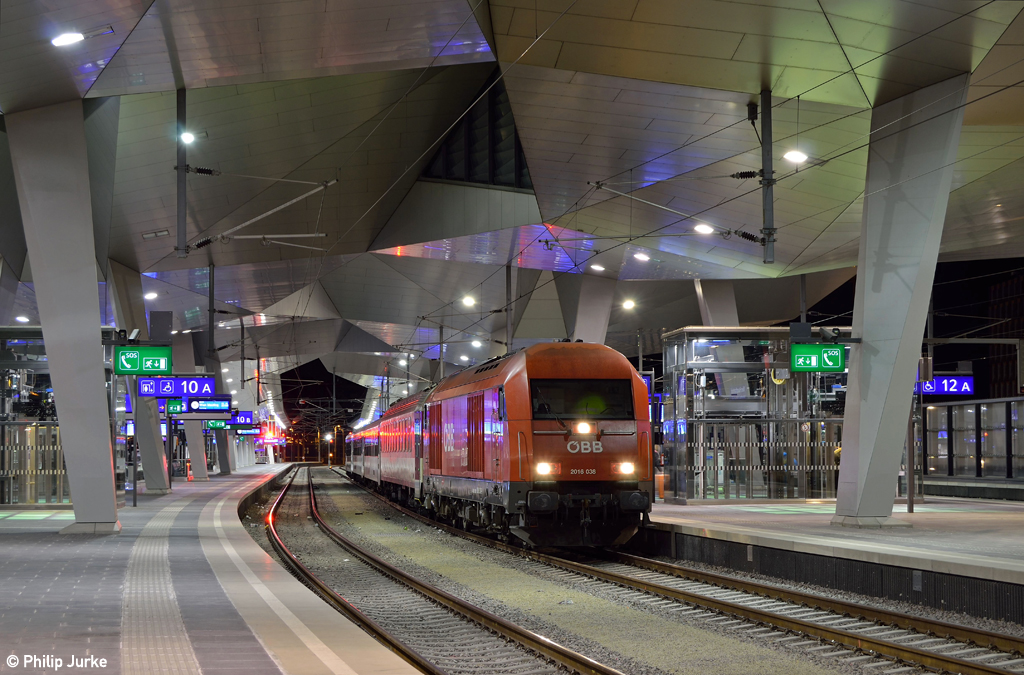 2016 038-8 mit dem REX 2535 (Bratislava hl. st. - Wien Hbf) am 06.04.2015 im Wiener Hbf.
