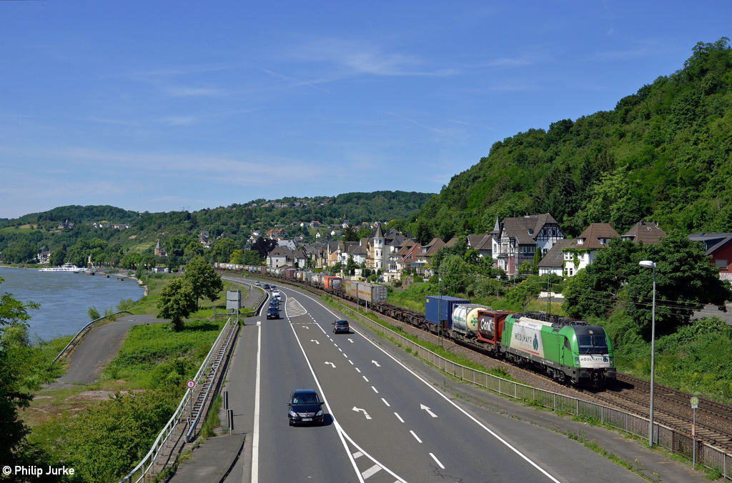 1216 954-8 mit einem KV-Zug am 14.06.2015 zwischen Linz am Rhein und Leubsdorf.